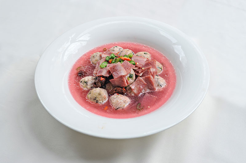 4.熱油將丸子炸到表皮變黃后撈出,倒入紅菇湯中,加入適量食鹽,開(kāi)鍋后,倒入培根丁,即可出鍋。