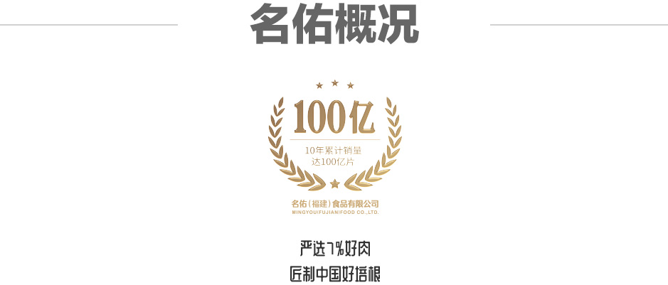 名佑(福建)食品有限公司從原料采購到生產(chǎn)加工過程,建立全程質(zhì)量追溯體系,主營培根系列產(chǎn)品經(jīng)過21道嚴(yán)苛生產(chǎn)工序(分割-配料-滾揉-裝模-煙熏-脫模-切片-裝袋-真空-裝箱等21道工序),生產(chǎn)出高質(zhì)量產(chǎn)品。公司先后獲得“農(nóng)業(yè)產(chǎn)業(yè)化國家級重點(diǎn)龍頭企業(yè)”、“省級重點(diǎn)龍頭企業(yè)”、“福建省科技小巨人領(lǐng)軍企業(yè)”、“福建省科技型企業(yè)”、“福建省西式肉制品生產(chǎn)標(biāo)桿企業(yè)”等榮譽(yù)稱號。名佑參與培根、火腿國家標(biāo)準(zhǔn)制定,核心產(chǎn)品“經(jīng)典培根”,被評為“福建省名牌產(chǎn)品”,榮獲《ITQI國際頂級美味獎(jiǎng)?wù)隆?,憑借著專業(yè)和美味受到了國內(nèi)外餐飲行業(yè)的一致好評。