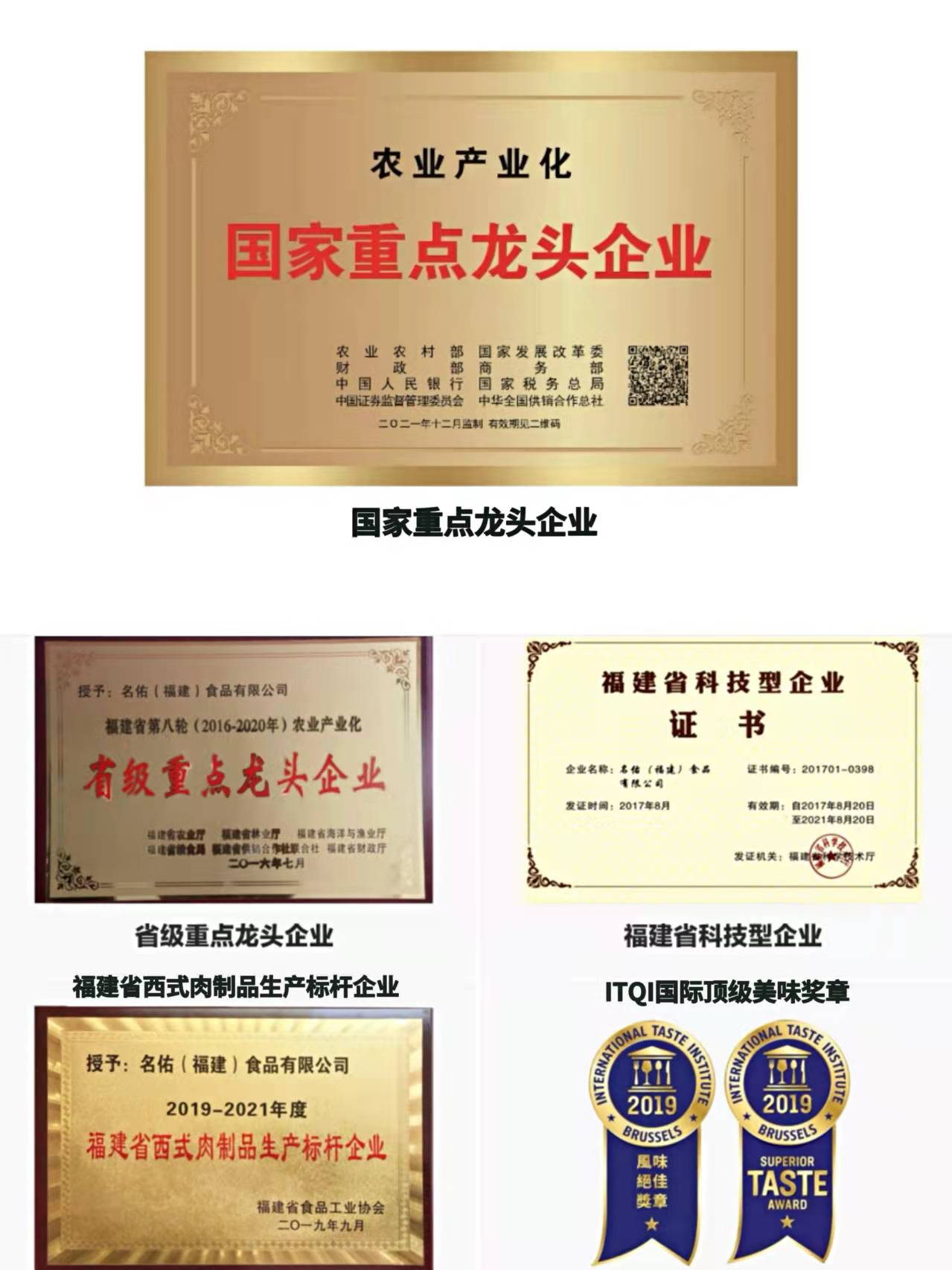 公司沿著“品牌化運(yùn)作,職業(yè)化經(jīng)營”戰(zhàn)略思想,在全體員工的共同努力下,“名佑”牌培根市場占有率不斷攀升,成為全國較大低溫西式肉制品培根制造商,不斷得到社會(huì)認(rèn)可和政府支持。公司被授予“農(nóng)業(yè)產(chǎn)業(yè)化國家級重點(diǎn)龍頭企業(yè)”、“全國模范職工之家”、“福建省民營企業(yè)黨建工作先進(jìn)單位”“福建省守合同重信用企業(yè)”、“福建省科技小巨人領(lǐng)軍企業(yè)”、“福建省西式肉制品生產(chǎn)標(biāo)桿企業(yè)”、“三明市十佳誠信用工企業(yè)”、“三元區(qū)納稅大戶”;公司“名佑”商標(biāo)被評為“福建省著名商標(biāo)”;公司經(jīng)典培根被評為“福建省名牌產(chǎn)品”,榮獲《ITQI國際頂級美味獎(jiǎng)?wù)隆?,憑借著專業(yè)和美味受到了國內(nèi)外餐飲行業(yè)的一致好評。